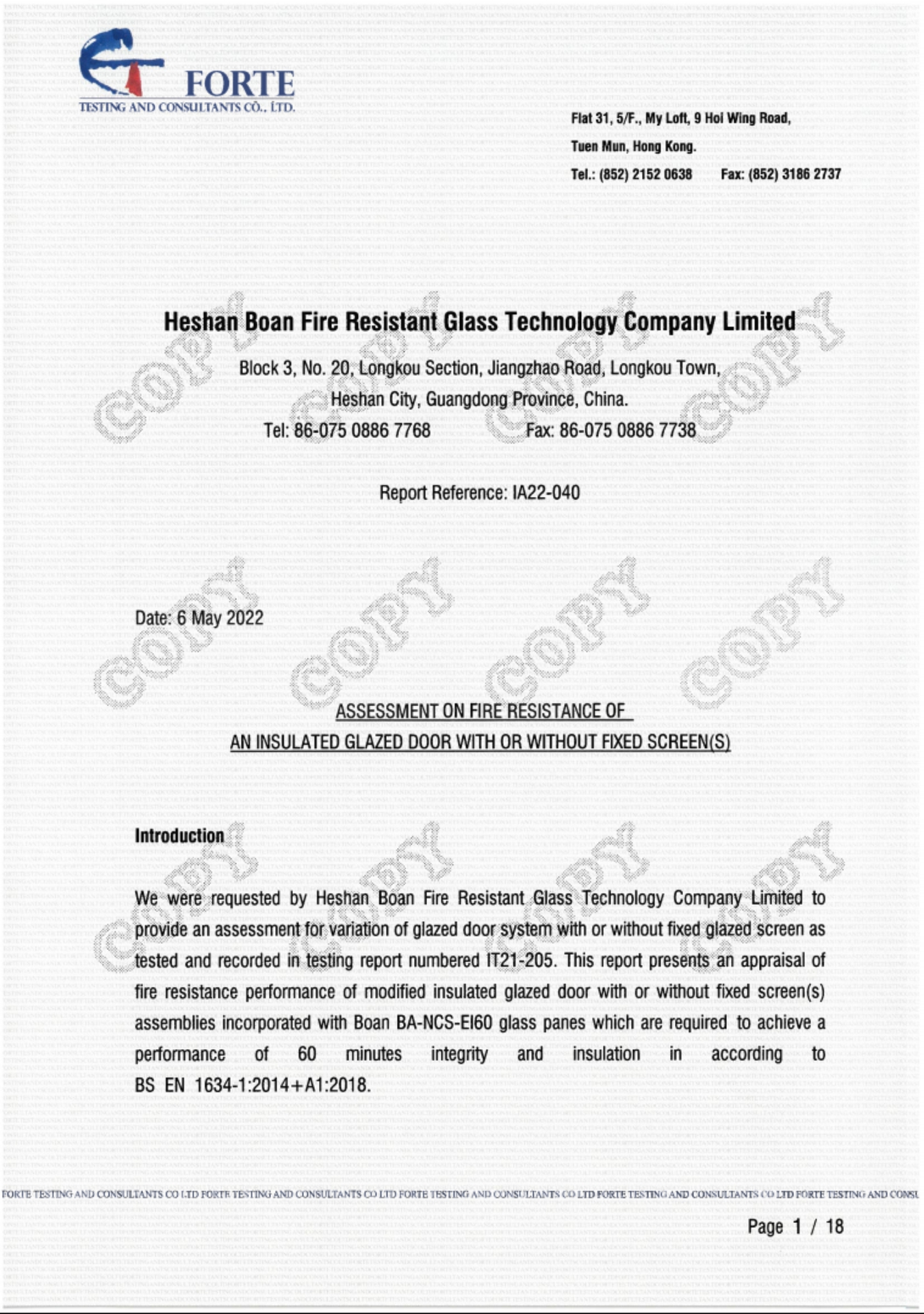 60mins-Assessment On Fire Resistance Of An Insulated Glazed Door With Or Without Fixed Screen(S)